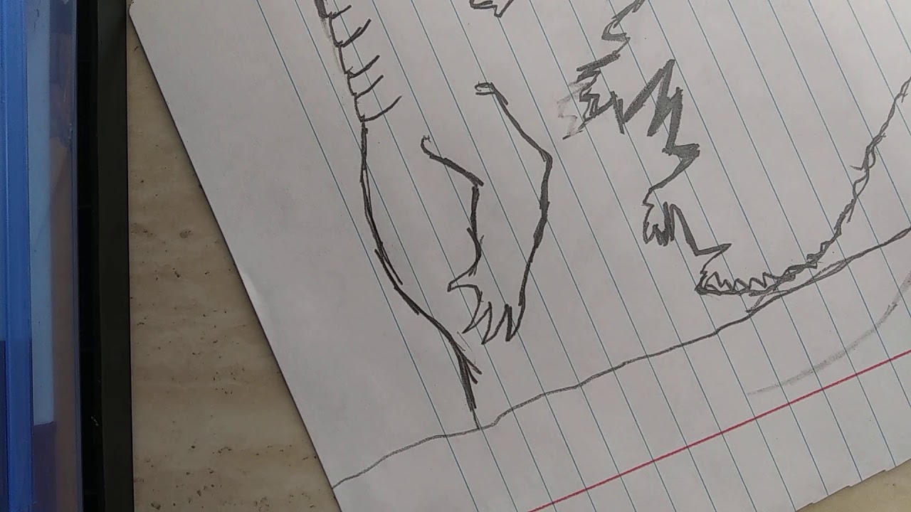 Draw a sketch of the head first focusing on the mouth because the mouth is a more detailed part of the head due to the mouth's shape, teeth, and tongue.